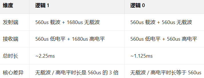 NEC 码规定:发射端先发射 560us 的 38kHz 载波(脉冲),再靠 "后续无载波的低电平时长" 区分 1/0(1 长、0 短);而接收头因检测特性,把 "有载波" 转为低电平、"无载波" 转为高电平,最终接收端看到的 1 是 "短低 + 长高",0 是 "短低 + 短高"。