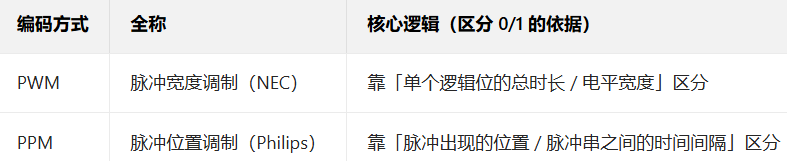 ✅ 若知道是 NEC 的 PWM:解码时要 "计时电平时长"------ 检测到低电平 560us 后,看后续高电平是 1680us(判 1)还是 560us(判 0);