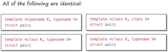 这两种形式是完全相同的,并且可以互换使用。它们之间的区别是 C++ 历史遗留下来的 ------ 最初,class被用来指代任何类型的名称,后来为了可读性,这一用法扩展到了typename。