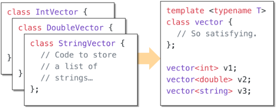模板 为这个问题提供了一种解决方案。我们将使用一个或多个模板参数为我们的类声明一个模板,这些参数在我们使用该模板时会被替换为特定的类型。