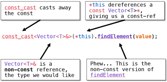 return const_cast<Vector<T>&>(*this).findElement(value);
