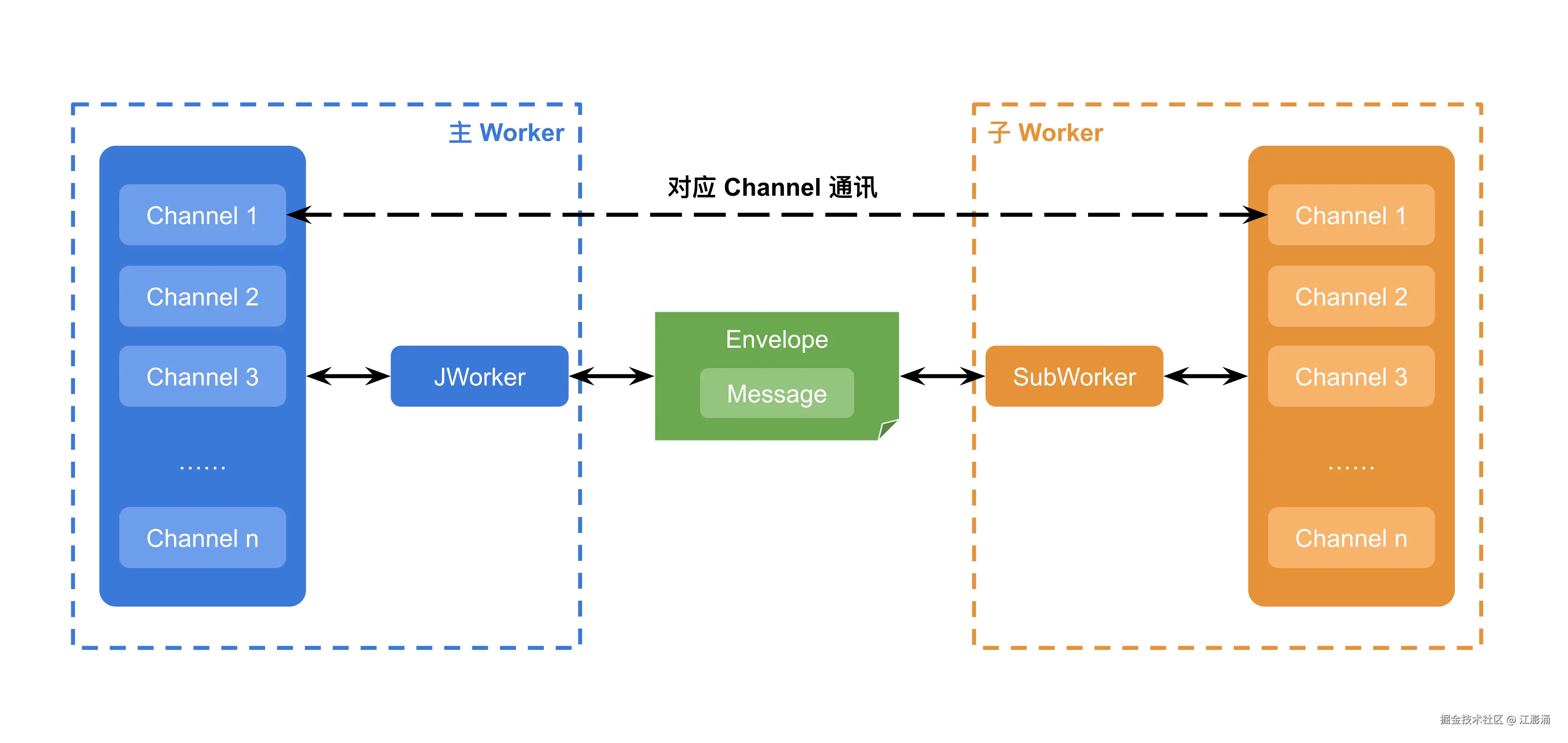 JWorker实例,添加渠道后进行各自 Worker 通讯。