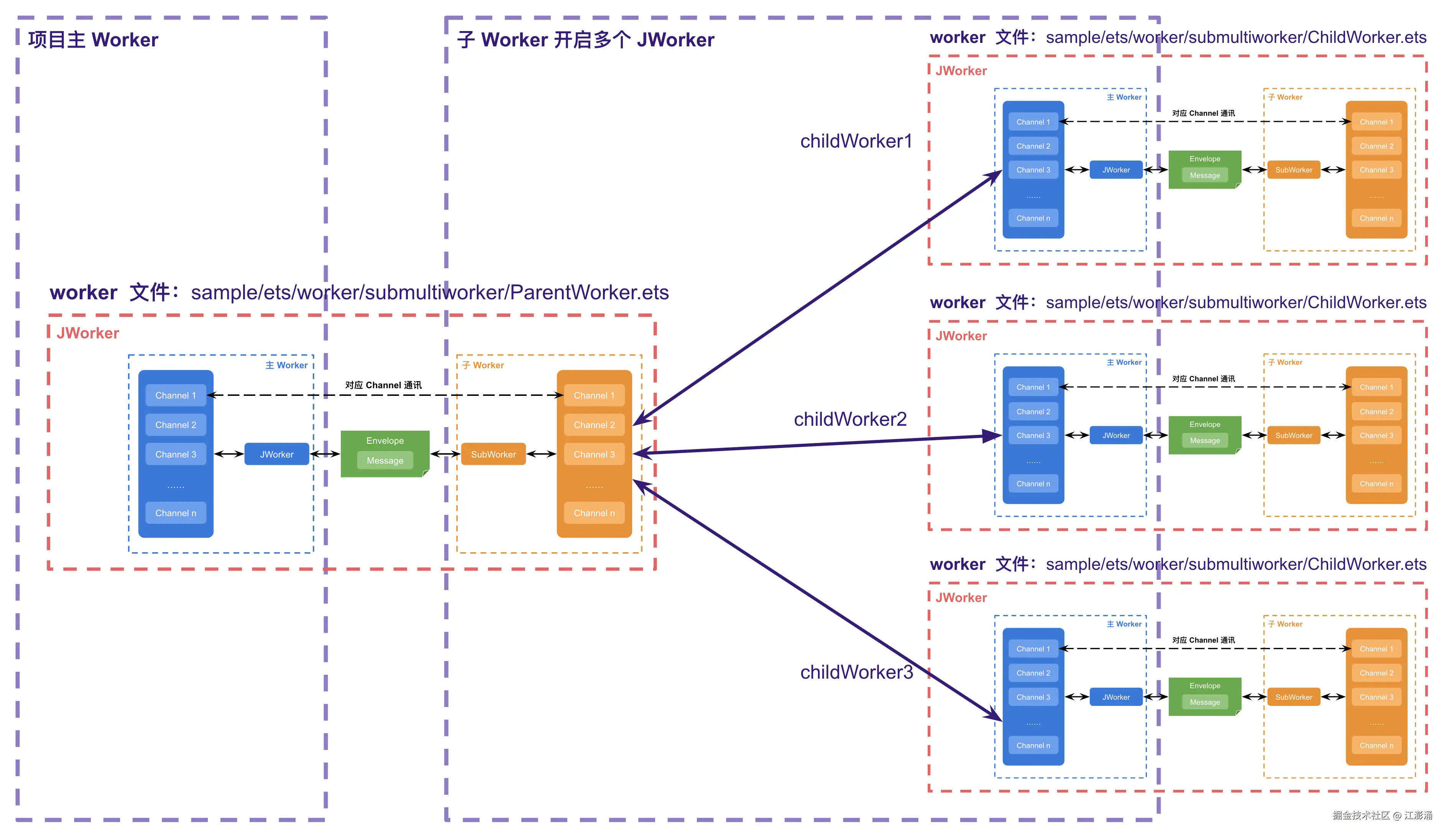 可以在子 Worker 需要创建子 Worker 的地方调用 createJWorker 方法创建 JWorker ,然后进行启动和添加相应 Channel 进行通讯。使用方式和之前的完全相同。