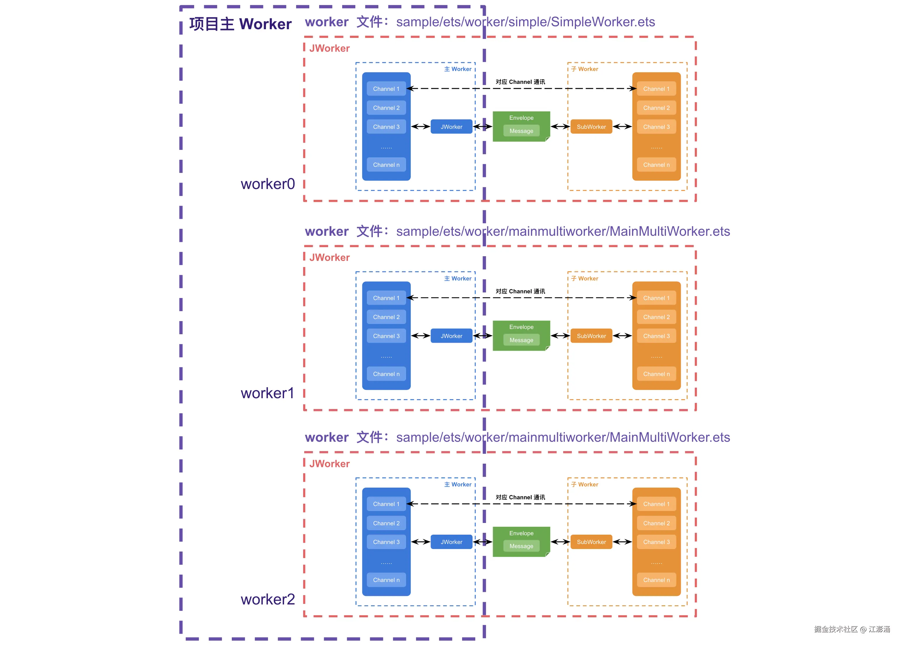 // worker0 和 worker1、worker2 使用不同的 Worker ets 文件进行开启不同的 JWorker 实例