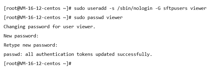 sudo useradd -g sftpusers -d /sftp/viewer -s /sbin/nologin viewer