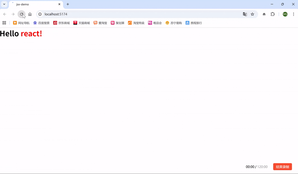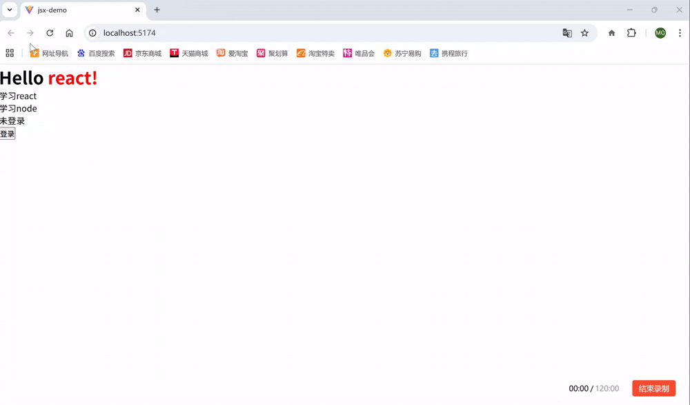 todos.length、isLoggedIn)动态展示不同 UI 内容。 - JSX 语法:在 JavaScript 中直接编写类似 HTML 的标签,同时支持嵌入变量(如