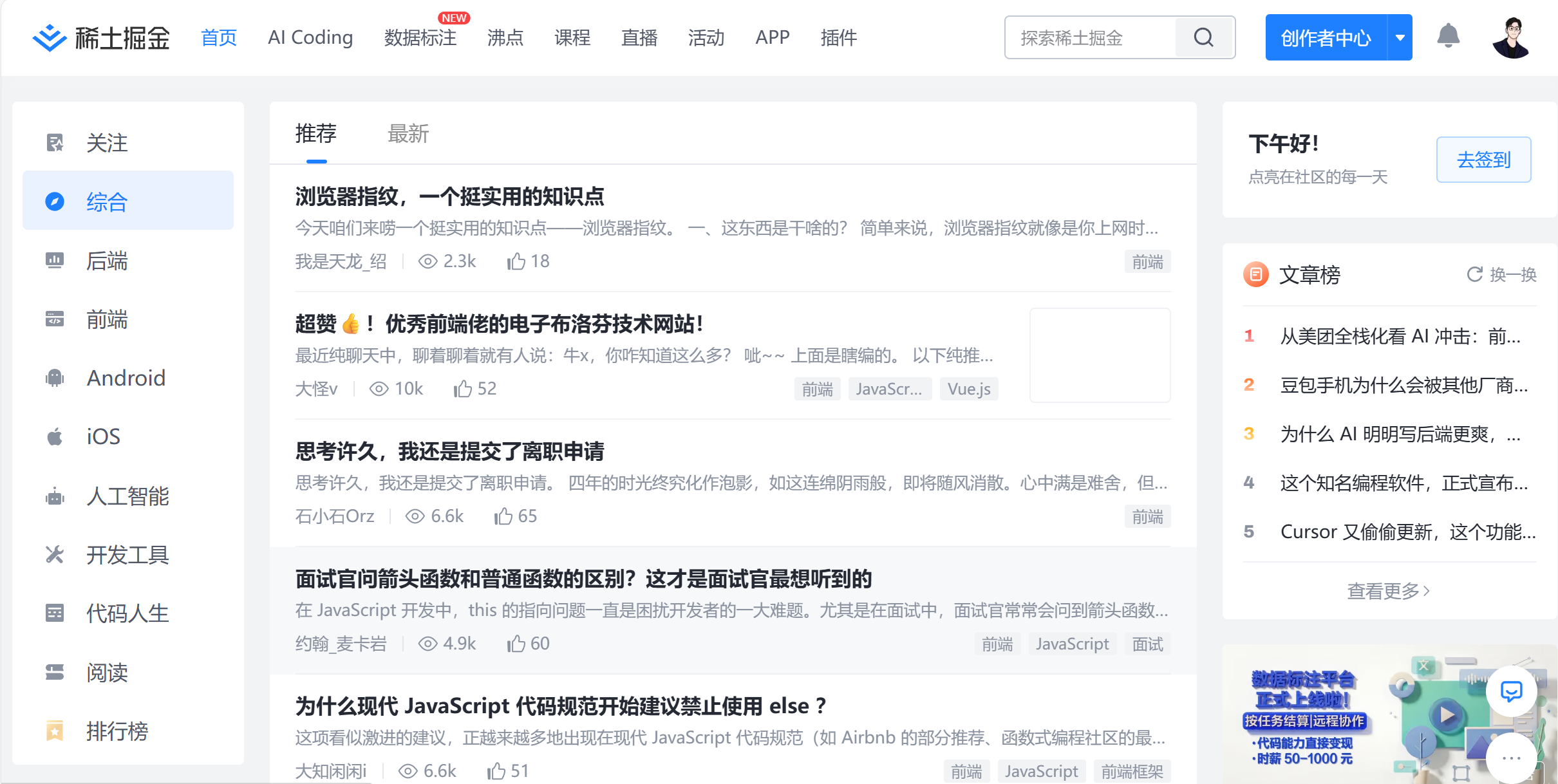 组件就像网页的 "功能模块"------ 把 HTML、CSS、JS 打包成一个独立单元,完成特定功能。比如下面的JuejinHeader是头部组件,Ariticles是文章列表组件,它们就像乐高积木,拼在一起就成了完整页面。