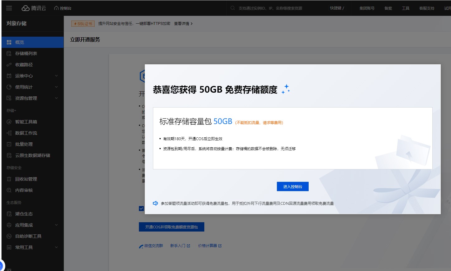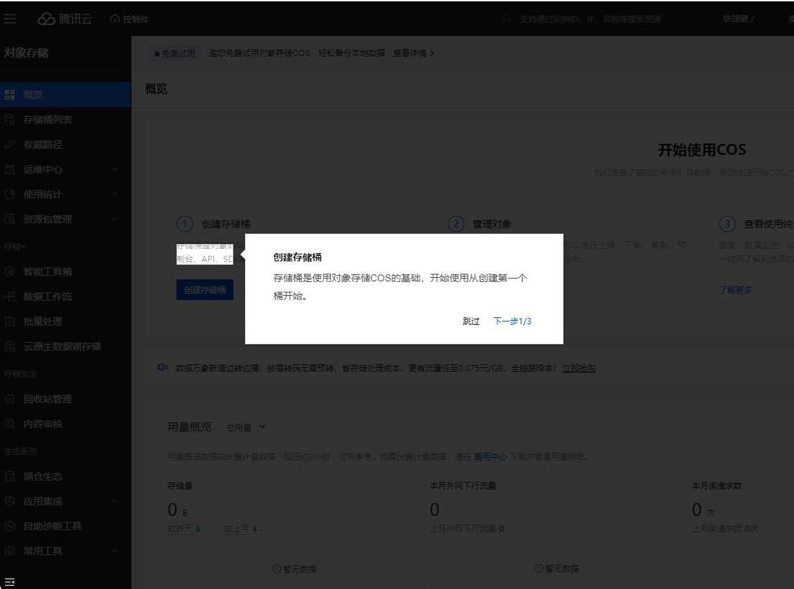 在控制台首页搜索"对象存储"或"COS",进入产品页面,点击"立即使用"或"开通"。新用户通常有免费额度。https://console.cloud.tencent.com/cos
