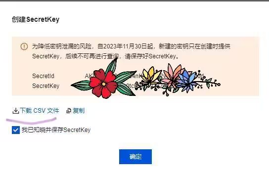 你会看到 SecretId 和 SecretKey。请像保护密码一样妥善保管,不要泄露或提交到公开的代码仓库(如GitHub)。