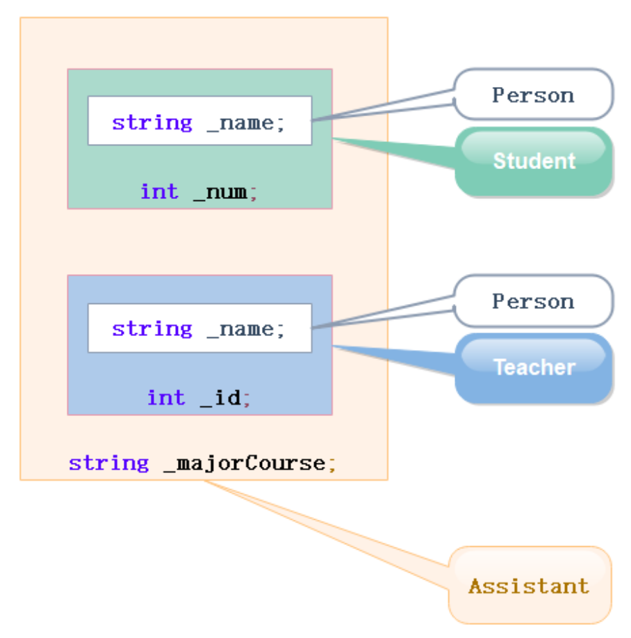 下面我们公共的成员都放到Person类中,Student和teacher都继承Person,就可以复用这些成员,就不需要重复定义了,省去了很多麻烦: