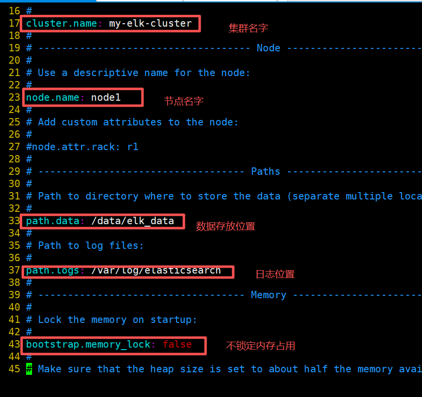 bootstrap.memory_lock: false ------------------------------43行改为在启动的时候不锁定内存