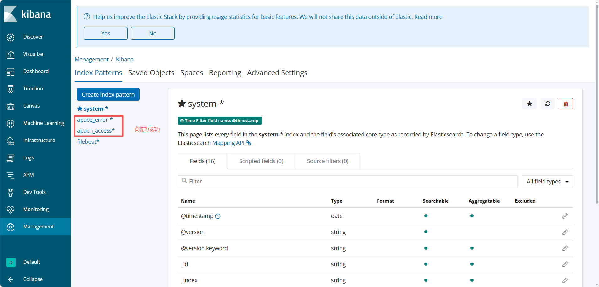 这里我们可以把刚刚创建的apache_access与apache_error索引创建进kibana。