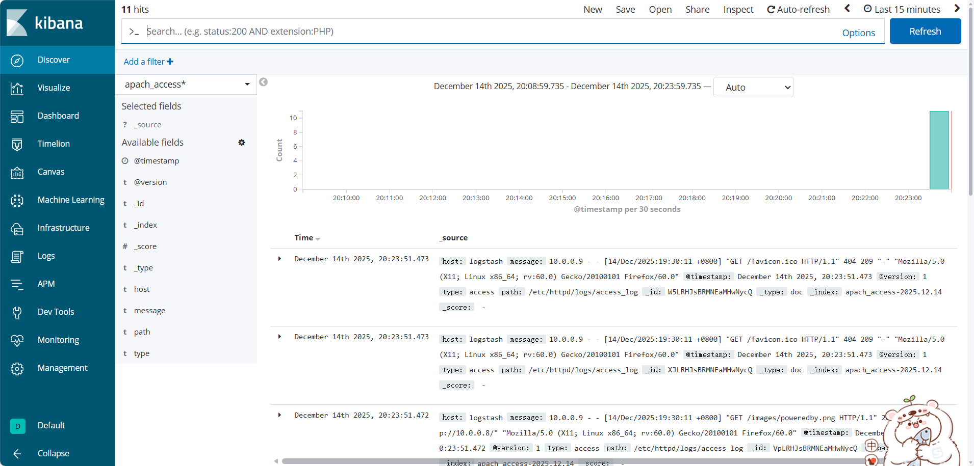 之后点击discover可以选择要查看的索引(以apache_acess为例)