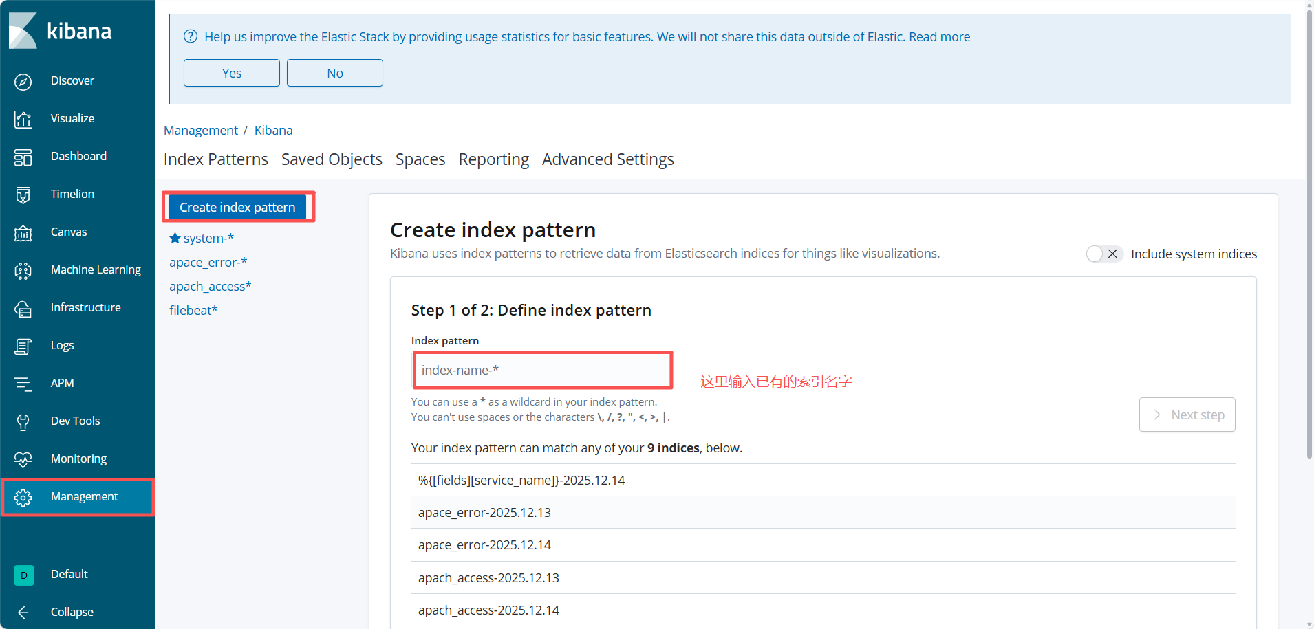 点击management ------》 点击 index Patterns ------》Create index patterns可以创建索引
