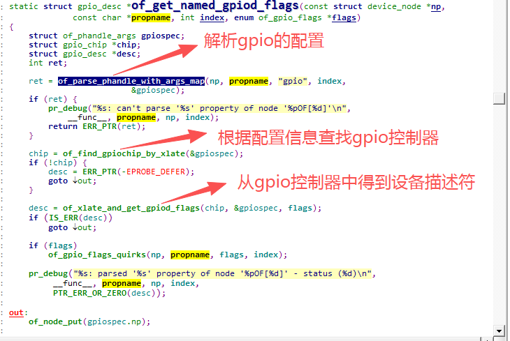 - of_parse_phandle_with_args_map是个系统函数,这里不用太关注。只需要关心其输出的结果gpiospec