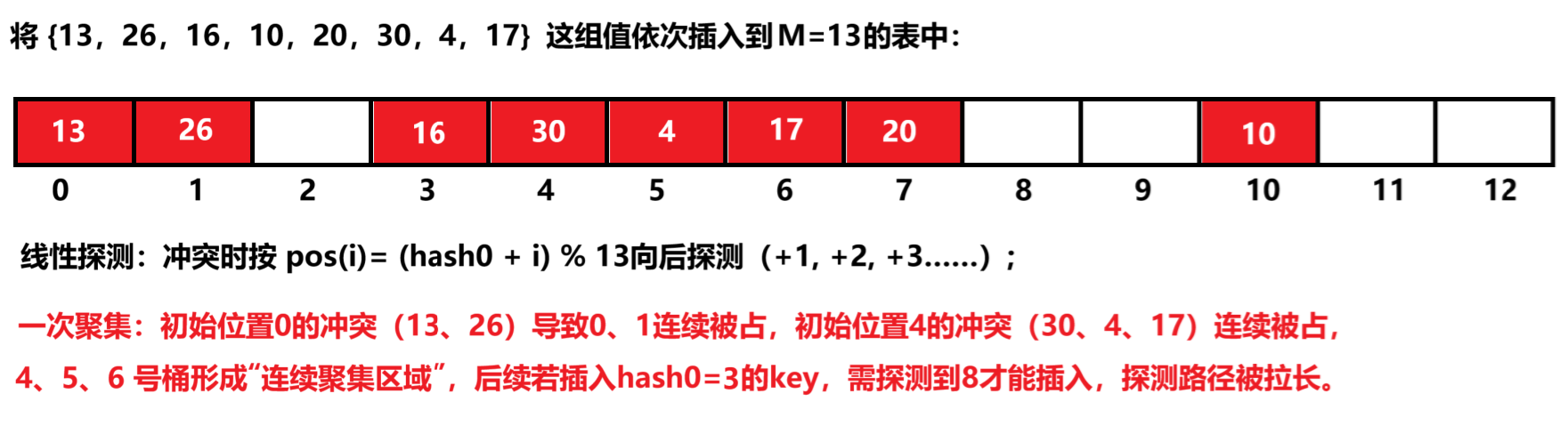 冲突后每次往后找一个位置,**最简单但易"堆积",**冲突元素扎堆成"块",后续探测需遍历整个块,效率骤降。