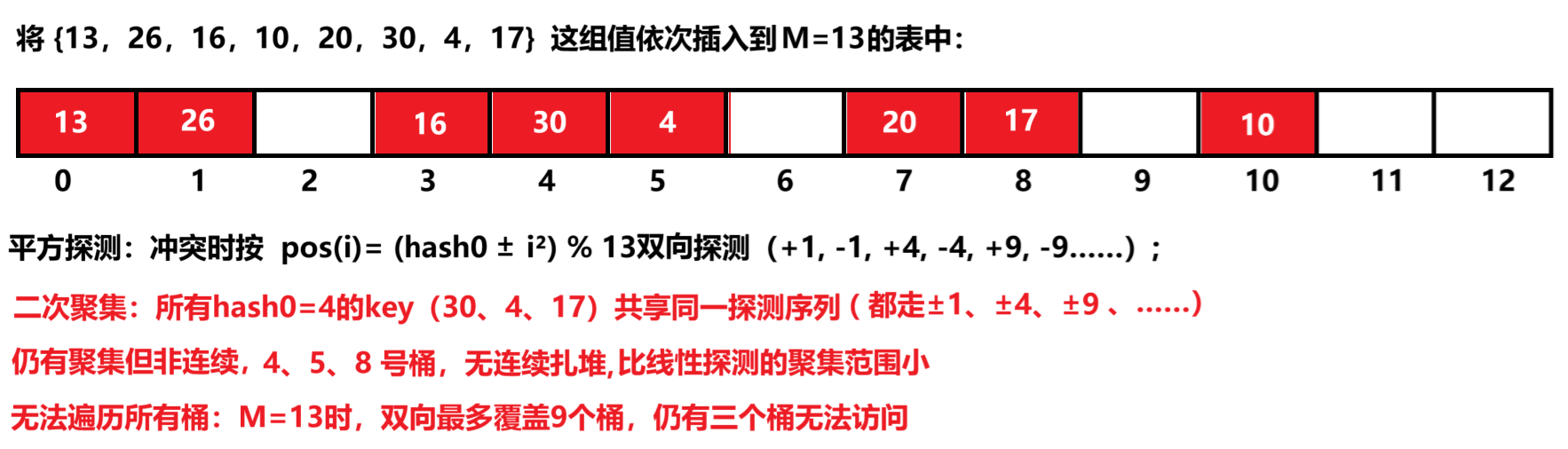 这种 "初始位置相同→探测序列完全重叠" 的现象称为二次聚集 ,会导致冲突 key 扎堆在同一组探测序列上,即使数组有其他空闲桶,也只能在重叠序列上竞争,最终探测次数急剧增加。平方探测存在天然的探测盲区, 平方探测的探测序列最多只能覆盖约 50% 的桶: