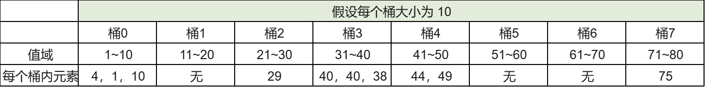 最小值为 1 ,最大值为 75 ,假设每个桶大小为 10 ,则需要 8 个桶: