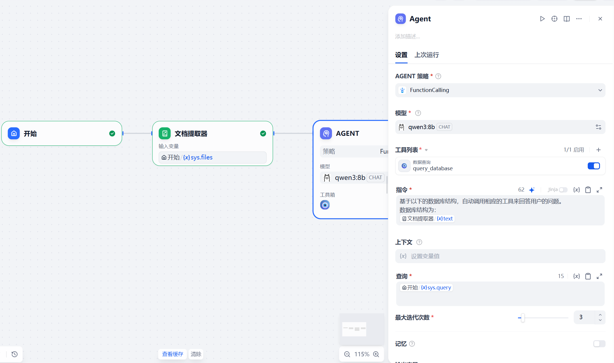 这里面的文档提取器节点用于对上传的数据库sql格式的文件进行解析,以获取文档的内容。Agent节点在工具列表中添加之前配置的MCP服务,并设置指令,如下图。