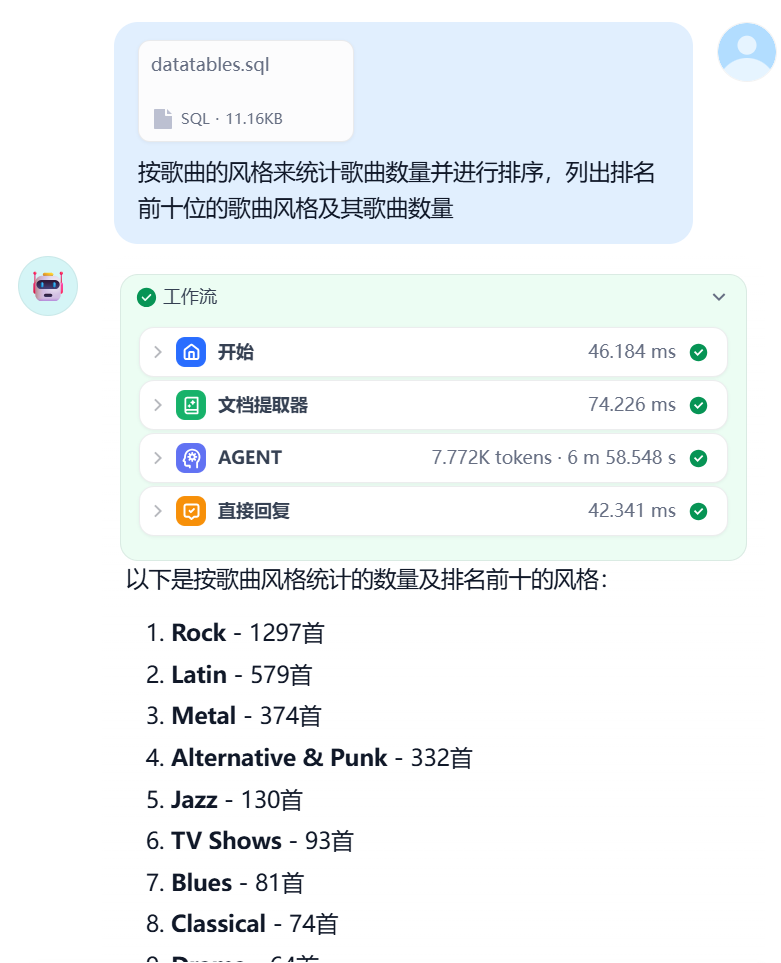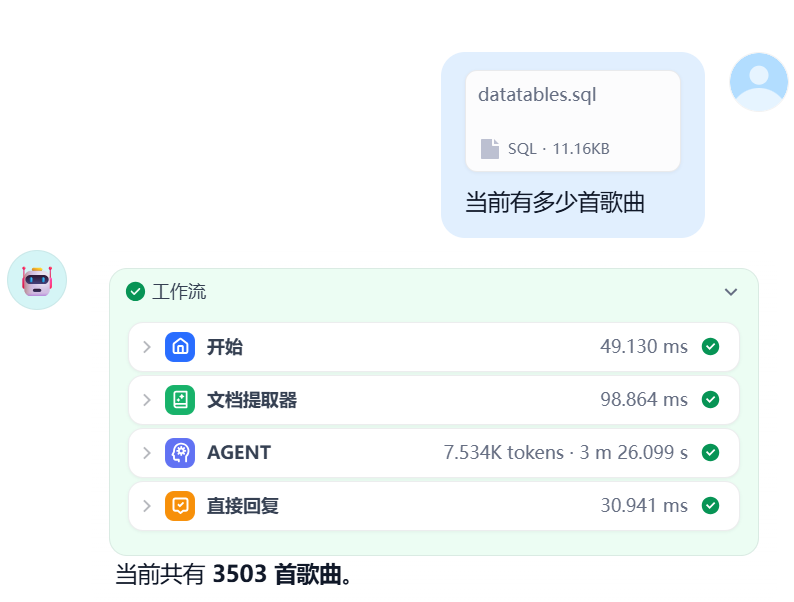 在对话窗口中上传之前创建的数据库格式的sql文件,然后询问"当前有多少首歌曲",Agent节点将基于数据库的格式,自动生成对应的SQL查询语句,然后进行回复。从MCP服务打印出的SQL语句"SELECT COUNT(*) FROM track;"来看,Agent节点的大模型正确的把用户的问题转换为数据库的查询语句,运行结果如下图所示。