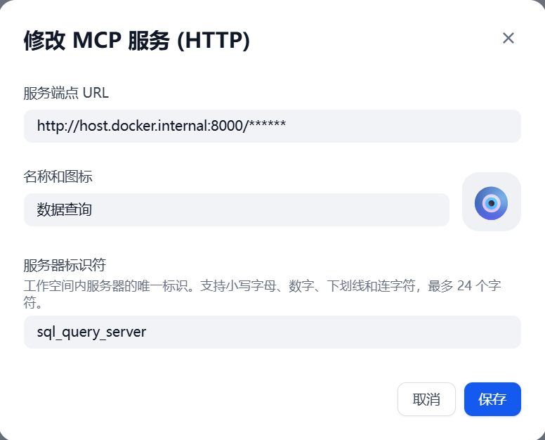 在Dify中,单击"工具"菜单,然后选择"MCP",最后单击"添加一个MCP服务",在设置中填入MCP服务的URL,之前启动的MCP服务的URL是http://127.0.0.1:8000/sse,因为我的Dify是在容器中运行的,所以这里的URL设置为http://host.docker.internal:8000/sse,设置后如下图。
