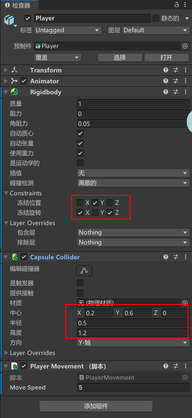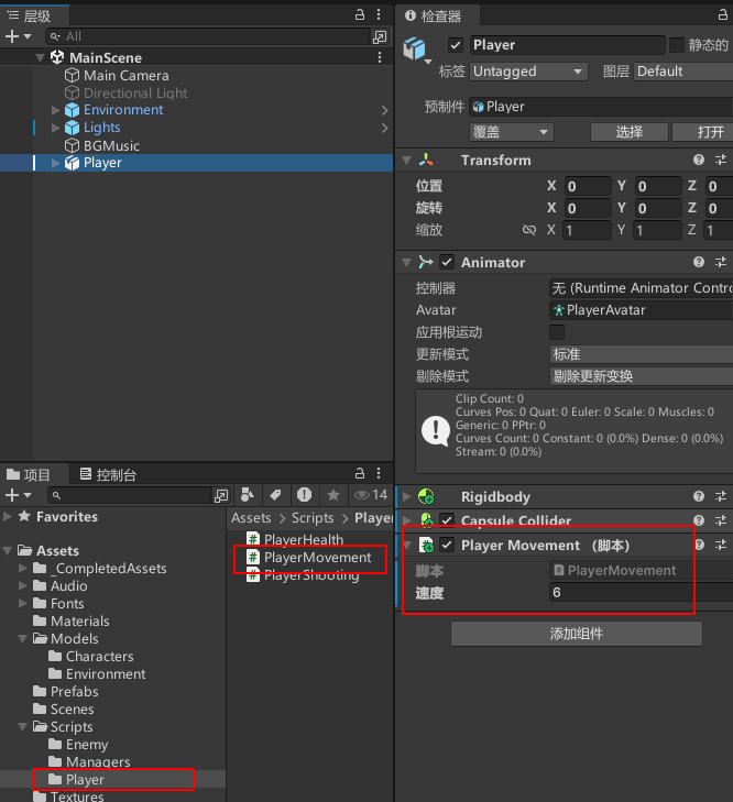 给"Player"添加脚本"PlayerMovement"