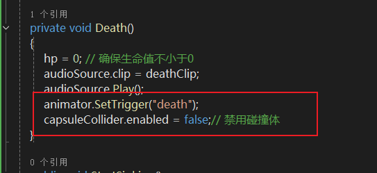 animator.SetTrigger("death");// 设置死亡动画触发器