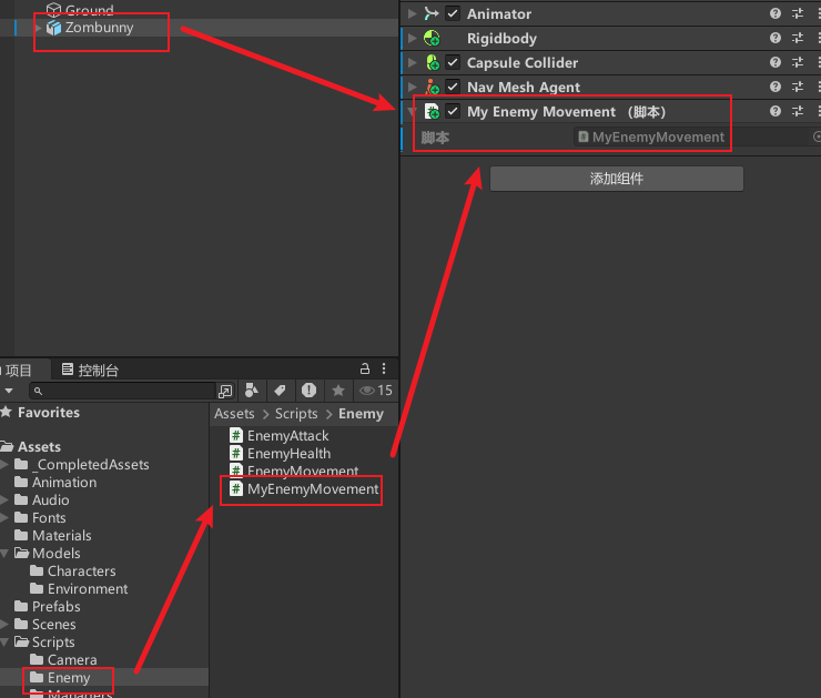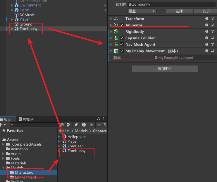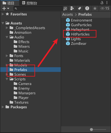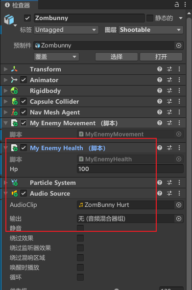 敌人物体添加组件血量脚本、被攻击粒子特效、被攻击声音