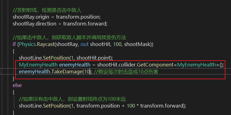 enemyHealth.TakeDamage(10); //假设每次射击造成10点伤害