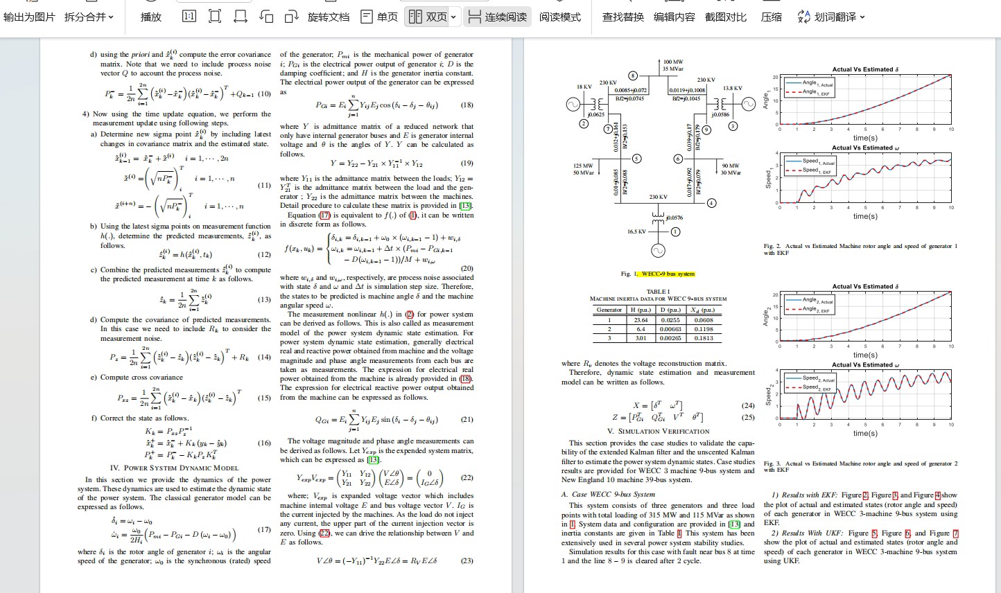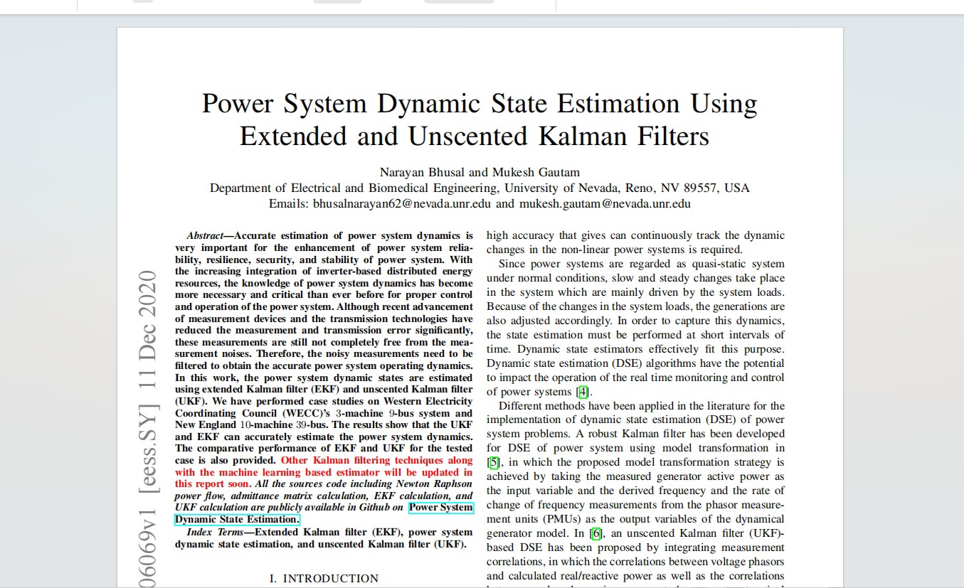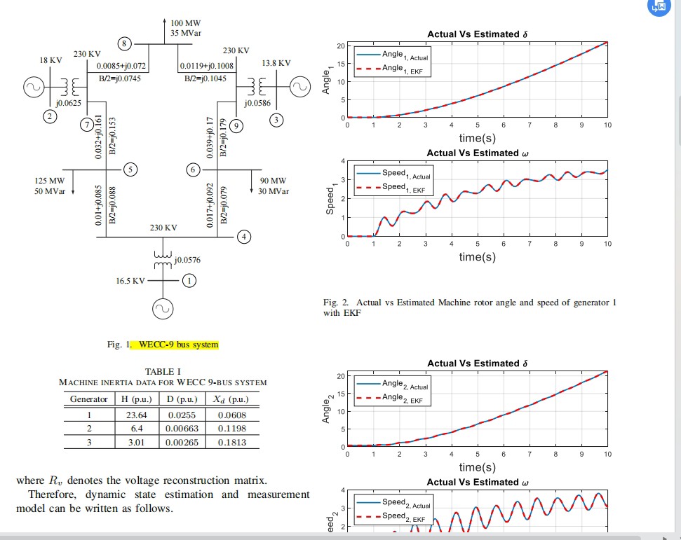 复现《基于扩展(EKF)和无迹卡尔曼滤波(UKF)的电力系统动态状态估计》 该程序对应文章《Power System Dynamic State Estimation Using Extended and Unscented Kalman Filters》,电力系统状态的准确估计对于提高电力系统的可靠性、弹性、安全性和稳定性具有重要意义,虽然近年来测量设备和传输技术的发展大大降低了测量和传输误差,但这些测量仍然不能完全没有测量噪声。 因此,需要对噪声测量值进行过滤,从而获得准确的电力系统运行动态。 本程序采用两种方法,分别是扩展卡尔曼滤波(EKF)和无迹卡尔曼滤波(UKF),对电力系统进行动态状态估计,以39节点系统为算例验证了方法的有效性。 注:该程序需要安装matpower插件,否则运行会报错。