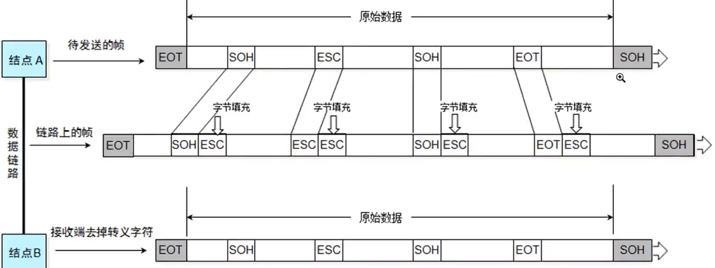 - 面向字节是的物理链路使用字节传输的方法实现透明传输