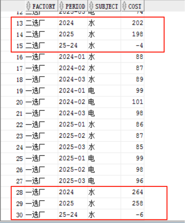 字段包括:选厂factory、期间period、科目subject、成本cost