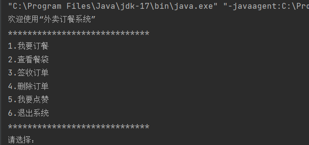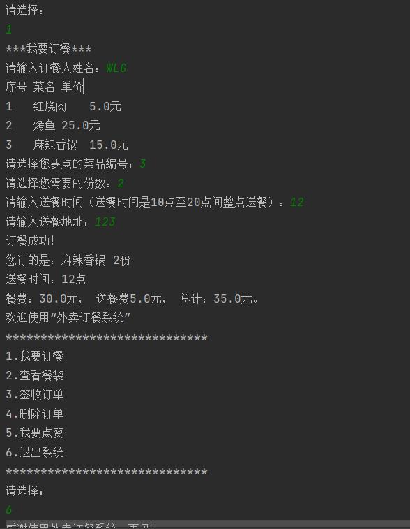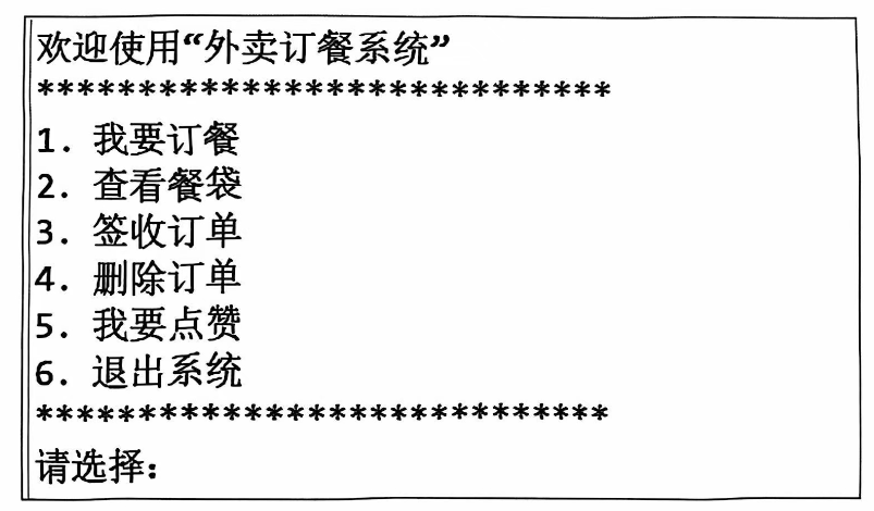 开发一个外卖订餐系统,需要实现"我要订餐"、"查看餐袋"、"签收订单"、"删除订单"、"我要点赞"和"退出系统"六个功能。项目运行结果如图1所示。