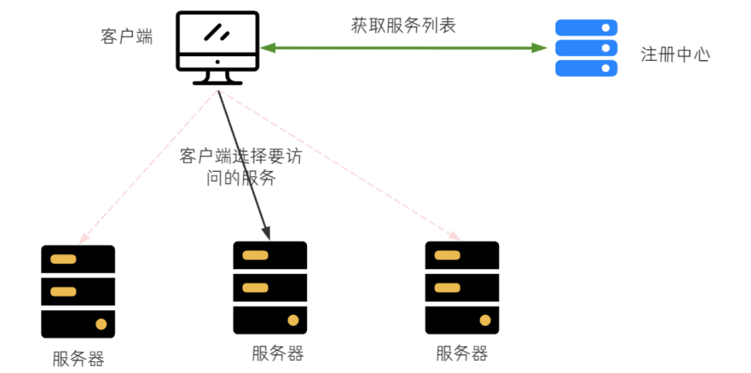 ⽐如Spring Cloud的Ribbon, 请求发送到客⼾端, 客⼾端从注册中⼼(⽐如Eureka)获取服务列表, 在发