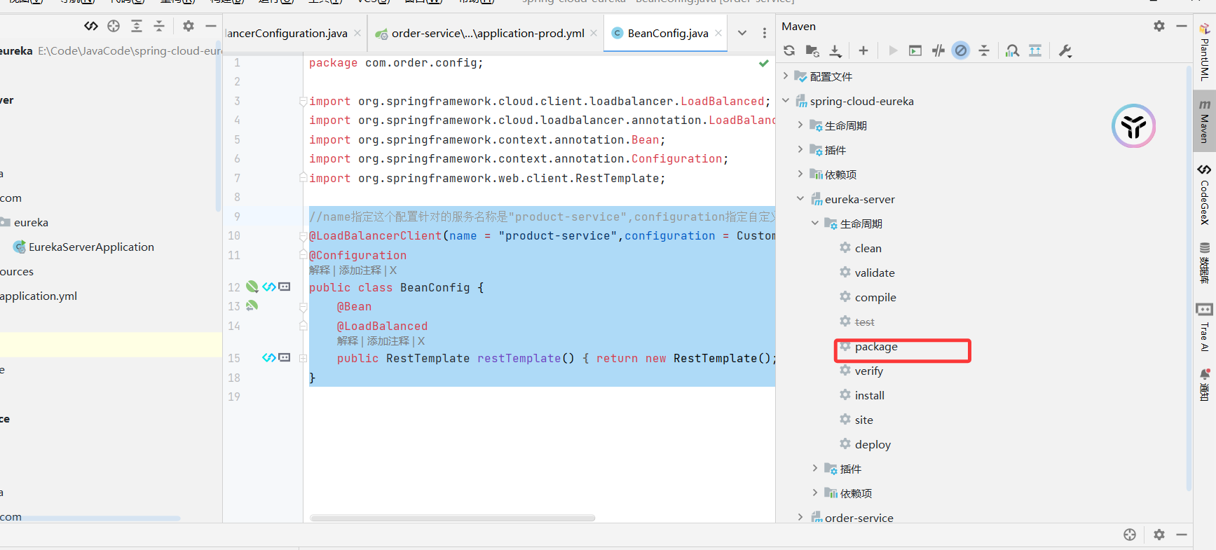//name指定这个配置针对的服务名称是"product-service",configuration指定自定义的负载均衡配置类