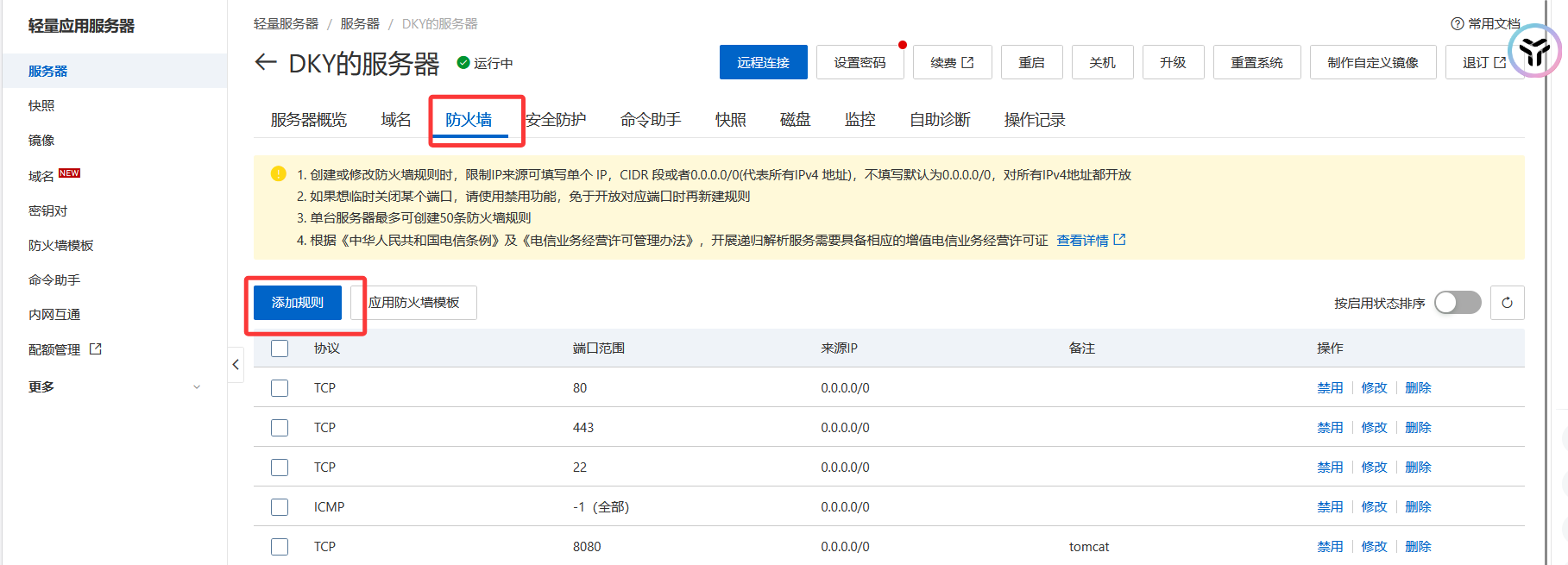 对于不同的服务厂商,开放端口号的方法不同,这里以阿里云为例