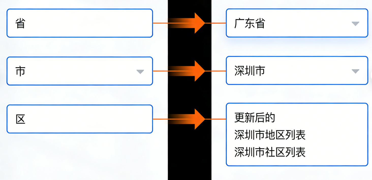 - 选择 "省份" 后,城市列表动态更新;选择 "城市" 后,区县列表动态更新。
