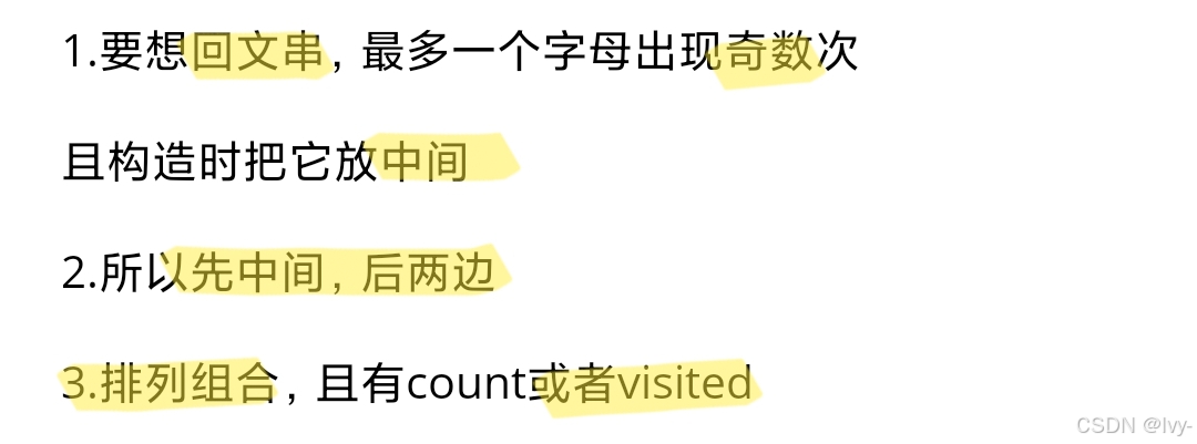 统计字符频率,确保++最多一个奇频字符(放回文中间)++