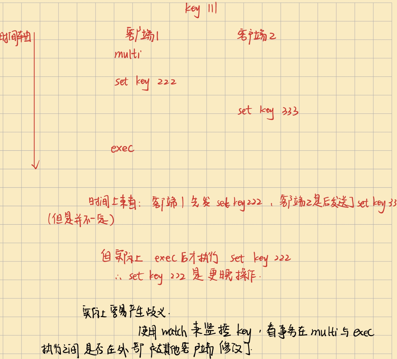 在执行事务的时候,如果某个事务中修改值,被别的客户端修改了,此时就容易出现数据不一致的情况