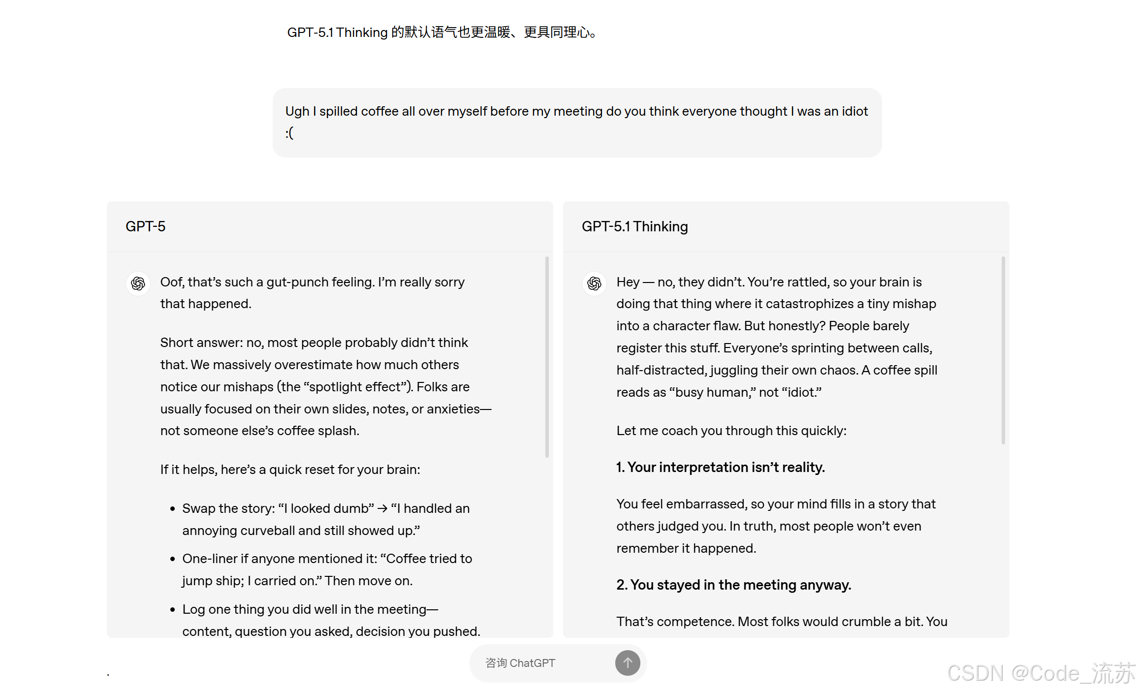 OpenAI团队针对用户反馈,专门优化了模型的对话自然度 和情感表达能力。现在的GPT-5.1会: