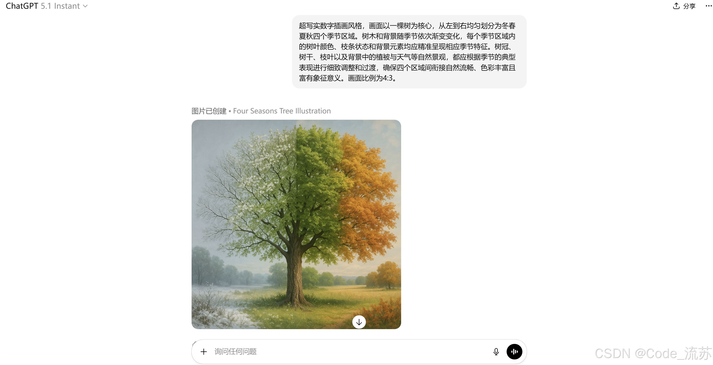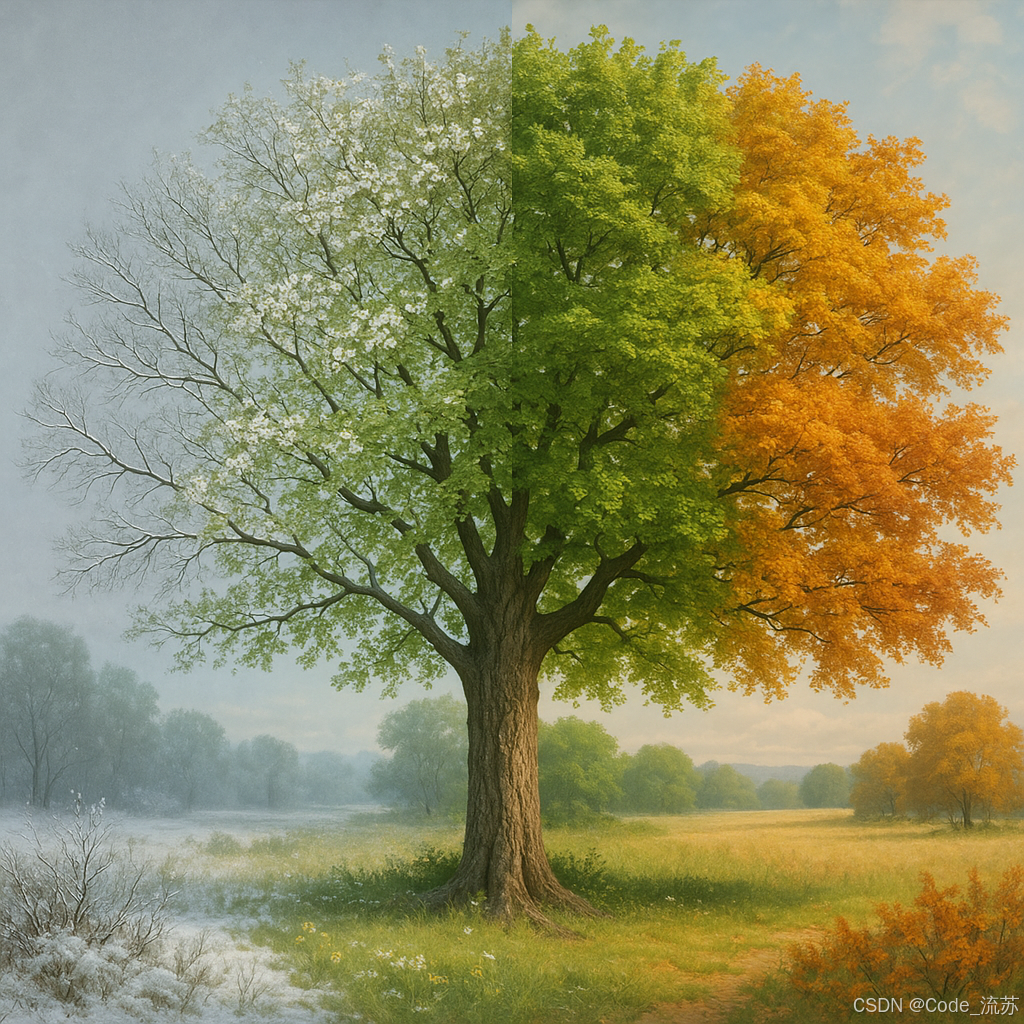 我:超写实数字插画风格,画面以一棵树为核心,从左到右均匀划分为冬春夏秋四个季节区域。树木和背景随季节依次渐变变化,每个季节区域内的树叶颜色、枝条状态和背景元素均应精准呈现相应季节特征。树冠、树干、枝叶以及背景中的植被与天气等自然景观,都应根据季节的典型表现进行细致调整和过渡,确保四个区域间衔接自然流畅、色彩丰富且富有象征意义。画面比例为4:3。