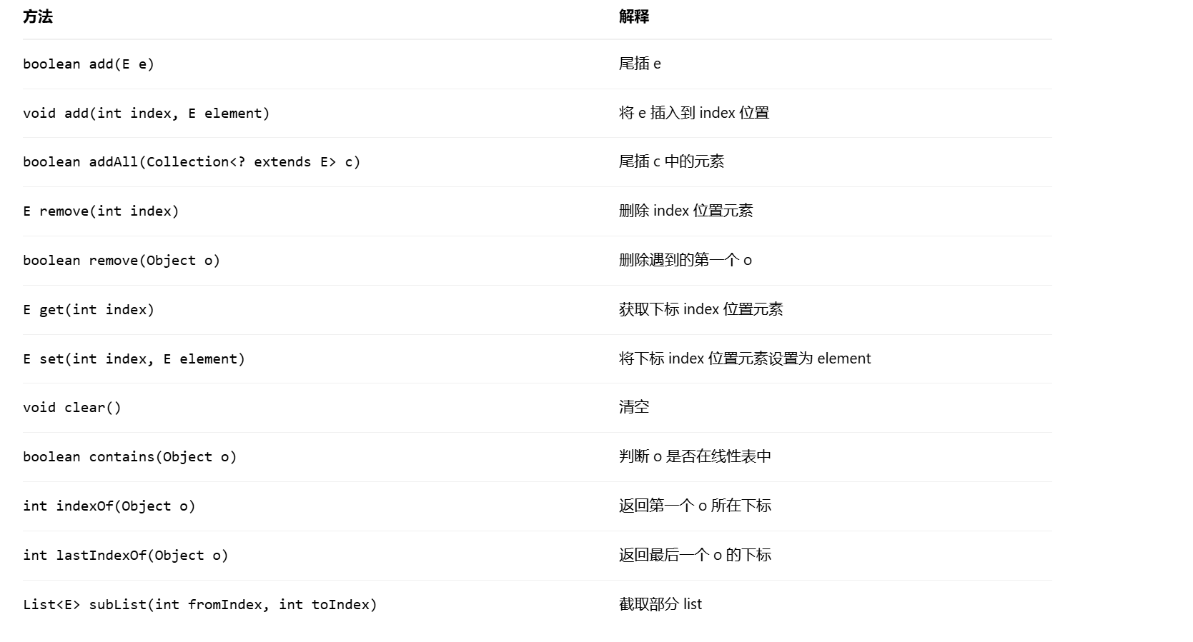 支持增删改查的全量列表操作,例如 add(E e)、remove(int index)、contains(Object o) 等。