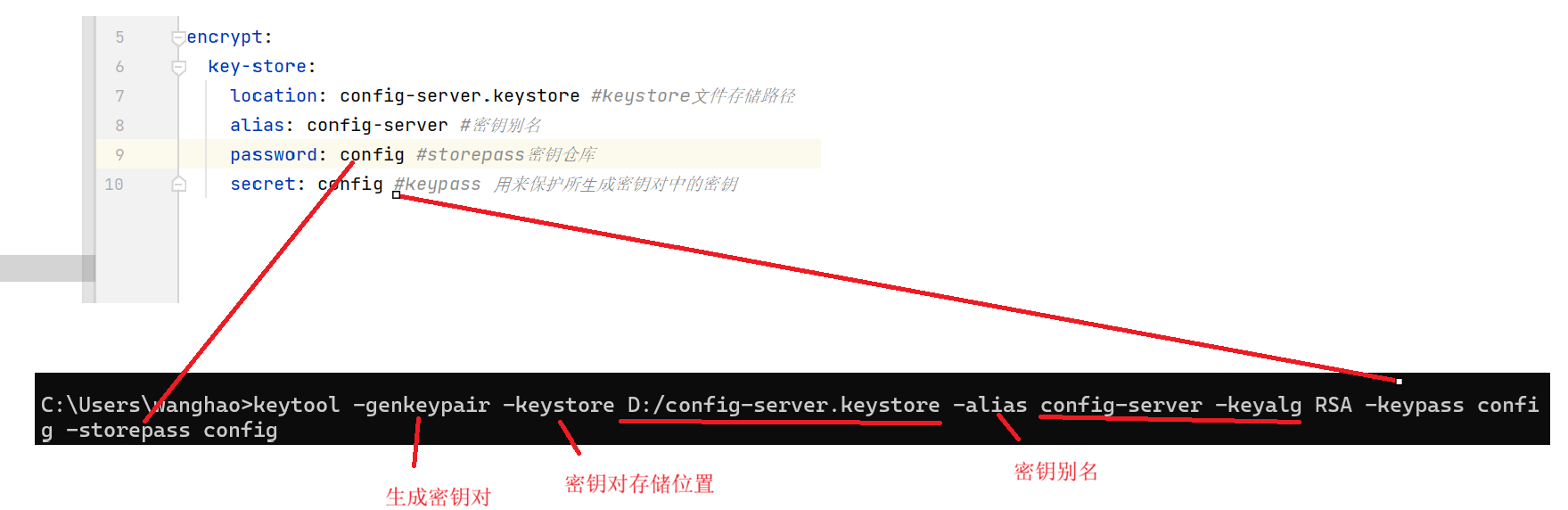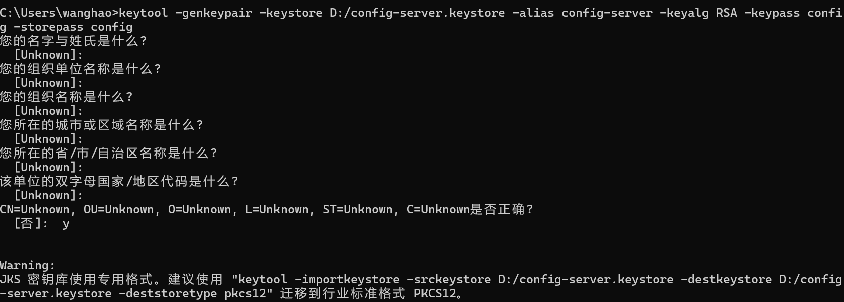 keytool -genkeypair -keystore D:/config-server.keystore -alias config-server -keyalg RSA -keypass config -storepass config