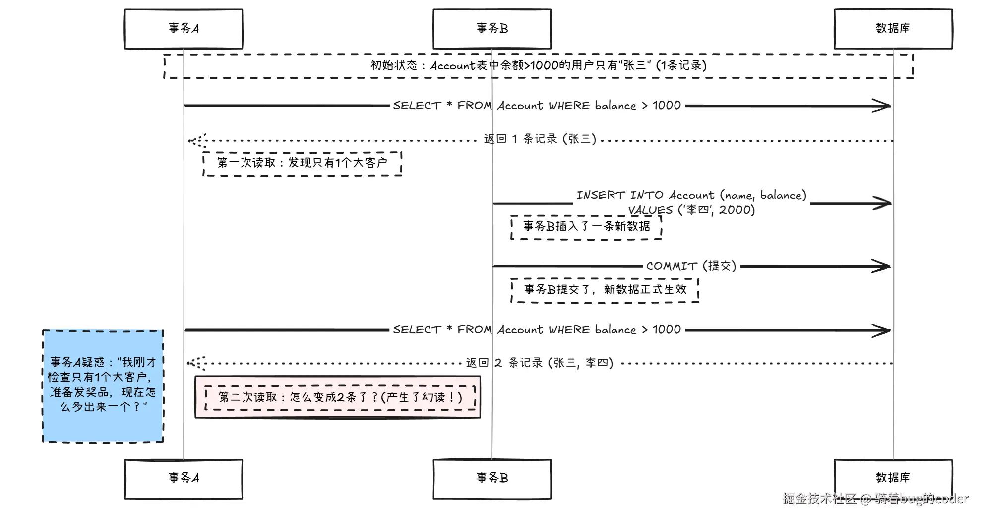 场景: 事务A查询"存款>1000的用户",发现只有1个。这时事务B插入了一个新用户并提交。事务A再次查询,发现变成了2个!就像产生了幻觉一样。