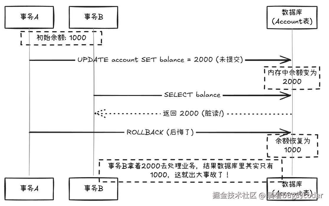 场景: 事务A修改了数据但还没提交,事务B却读到了这个修改。结果事务A回滚了,事务B读到的就是"脏数据"。