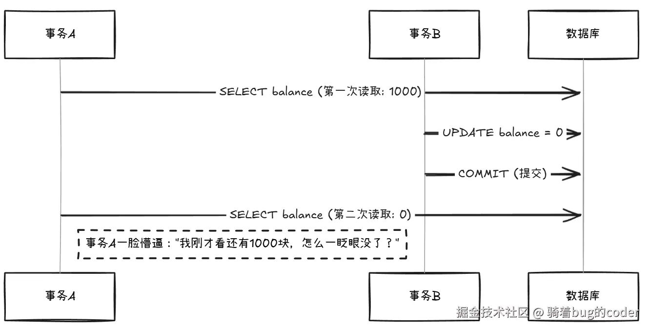 场景: 事务A先读了一次数据,然后事务B修改并提交了。事务A再读一次,发现数据变了! "不可重复读"的意思就是:在同一个事务里,同样的查询,读到的结果不一致。