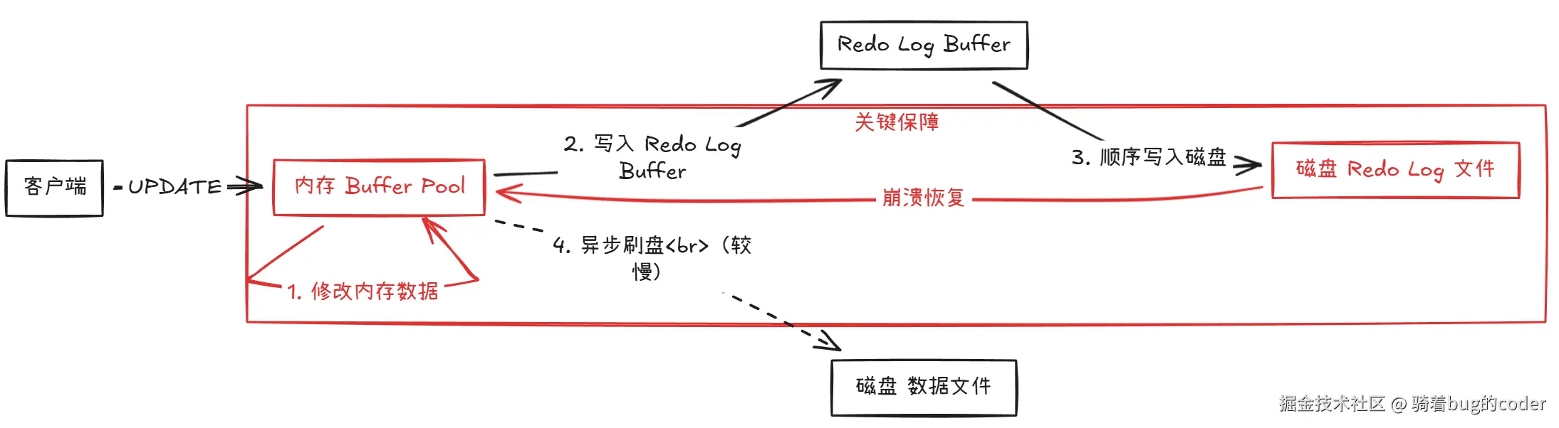- 如果断电,重启后读取Redo Log,把没写进磁盘的数据"重做"一遍。
