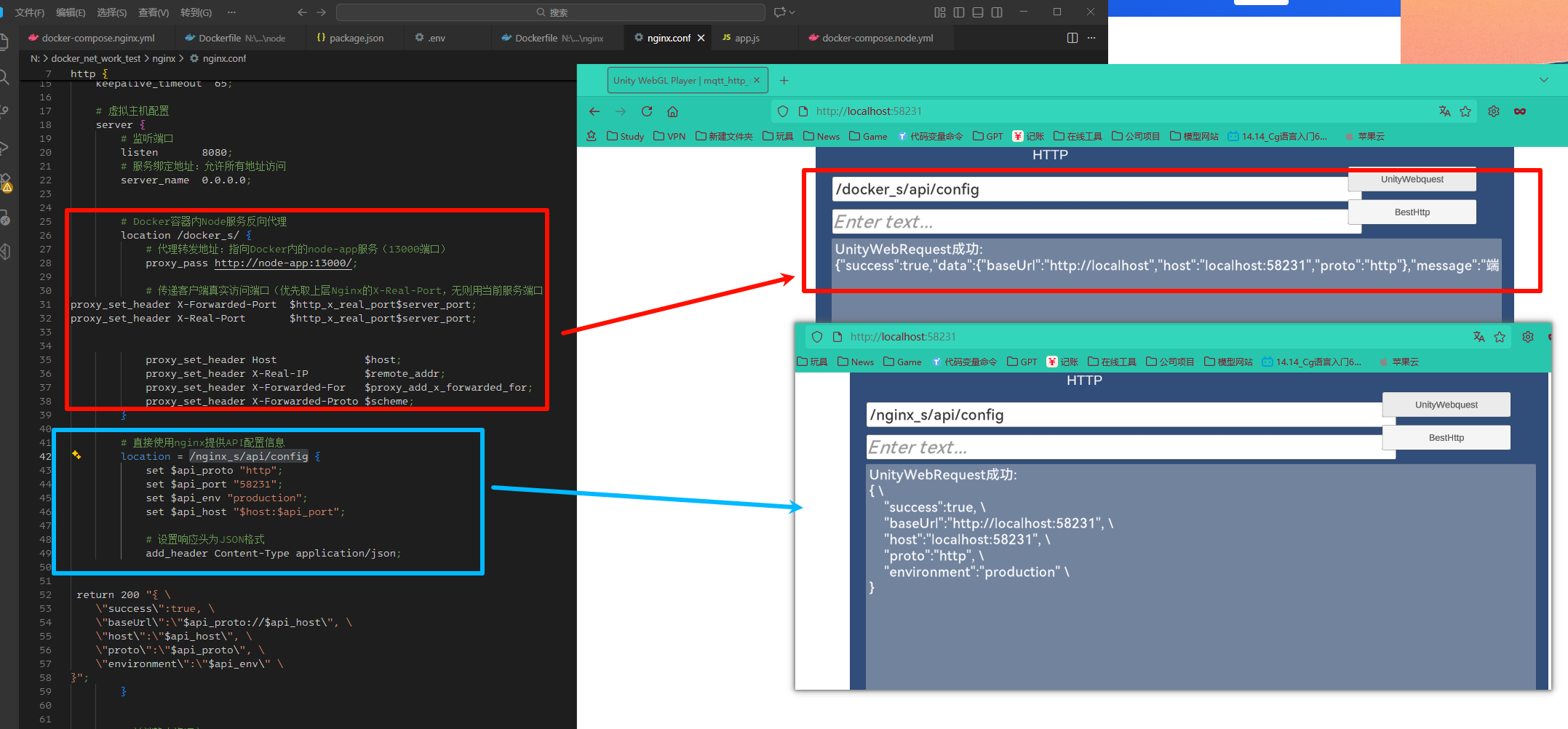 通过 Docker Compose 统一编排 Nginx、Node.js 服务,实现前后端分离部署。前端使用 Unity WebGL 创建交互式界面,后端基于 Node.js 提供 REST API 通信。重点讲解网络配置、反向代理策略、端口映射、跨域处理等实战中遇到的问题及解决方案,为应用部署提供完整参考。