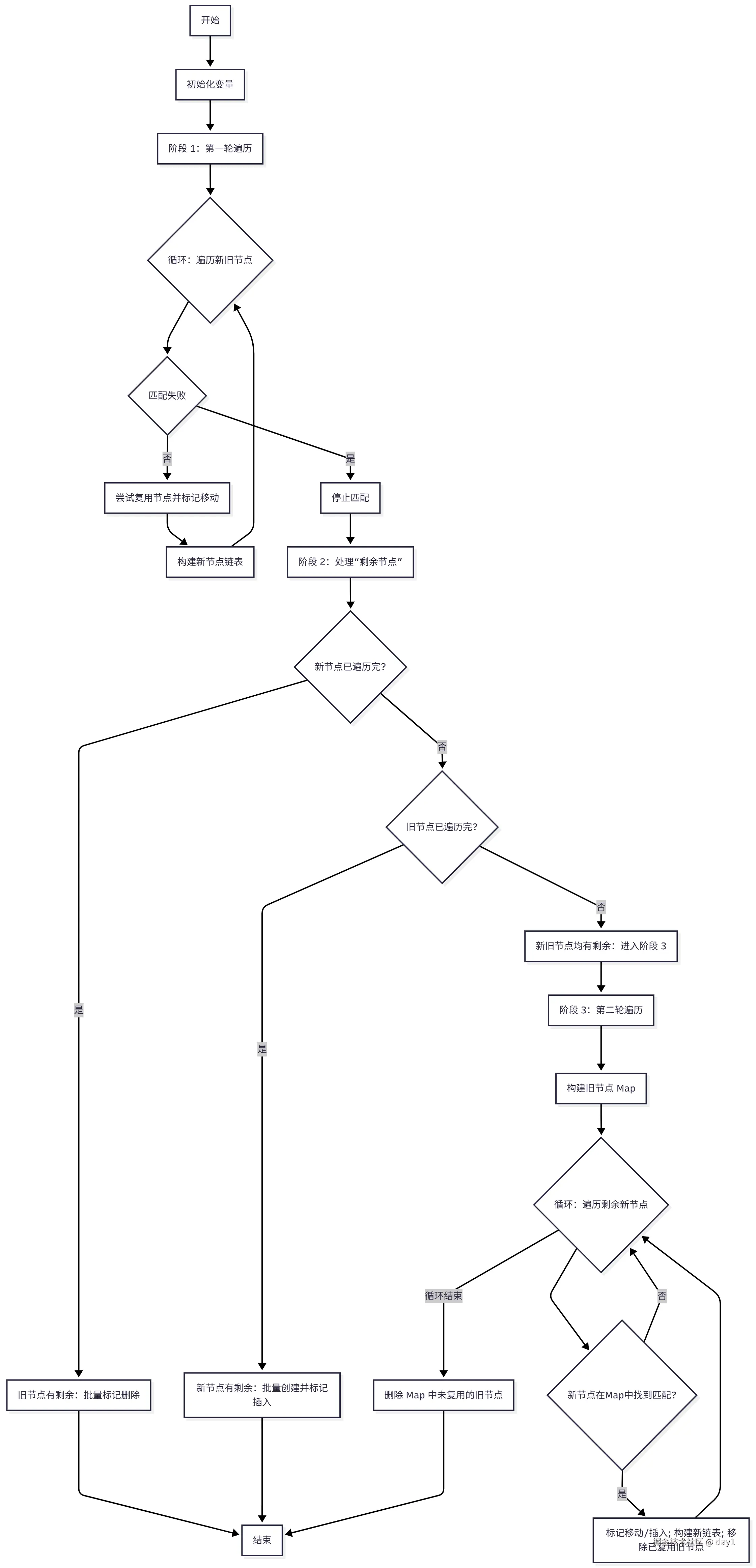 - 清理未复用旧节点:Map 中剩余的旧节点均为"未被复用",批量标记删除。