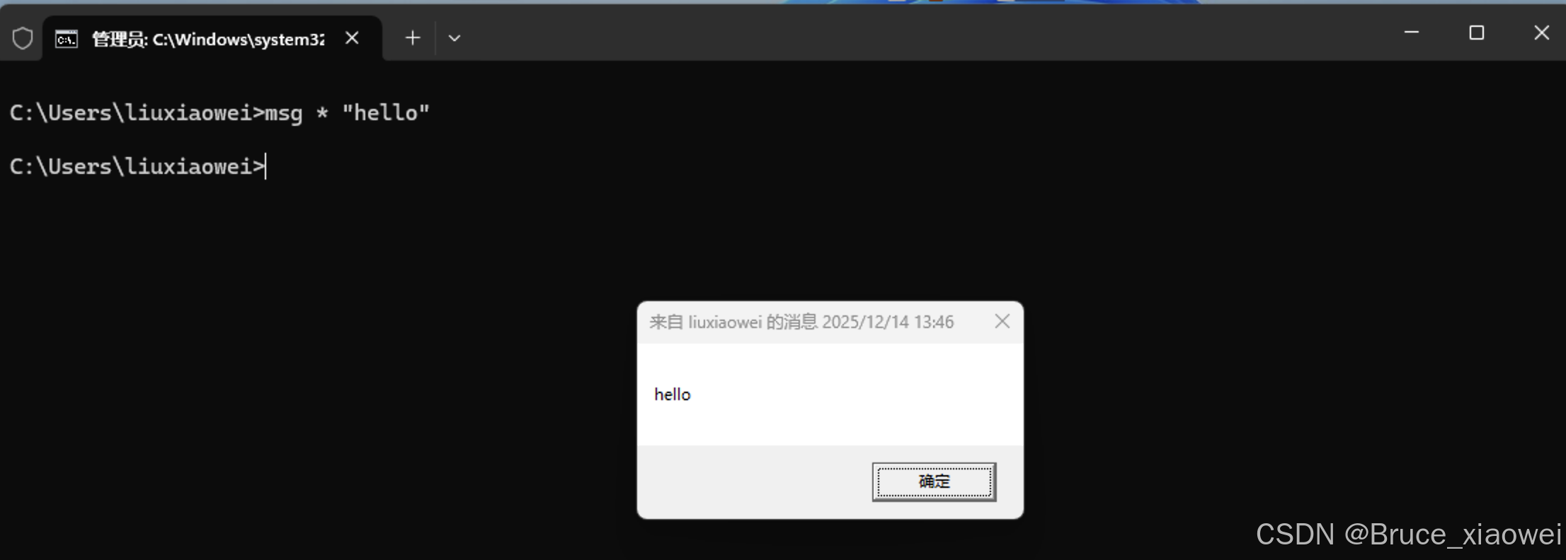 效果:当前用户的 cmd/PowerShell 窗口会弹出消息框(标题为"Message from XXX on YYY")。